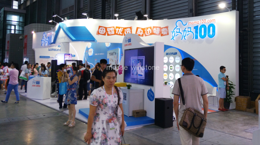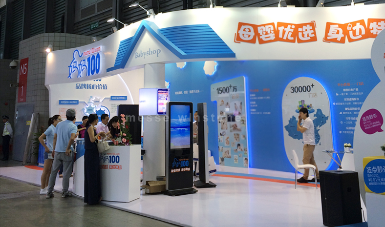 育嬰童展會現(xiàn)場,展臺整體采用全烤漆材質,背墻鋼化玻璃襯托,為客戶呈現(xiàn)品質建設。